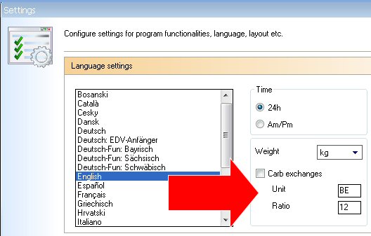 In case you prefer other settings like, for instance 10 gr. carbohydrates for 1 KE or 12 gr. for 1 BE you can change the value of the exchange unit in the menu 'Extras ->Settings ->Language Settings':