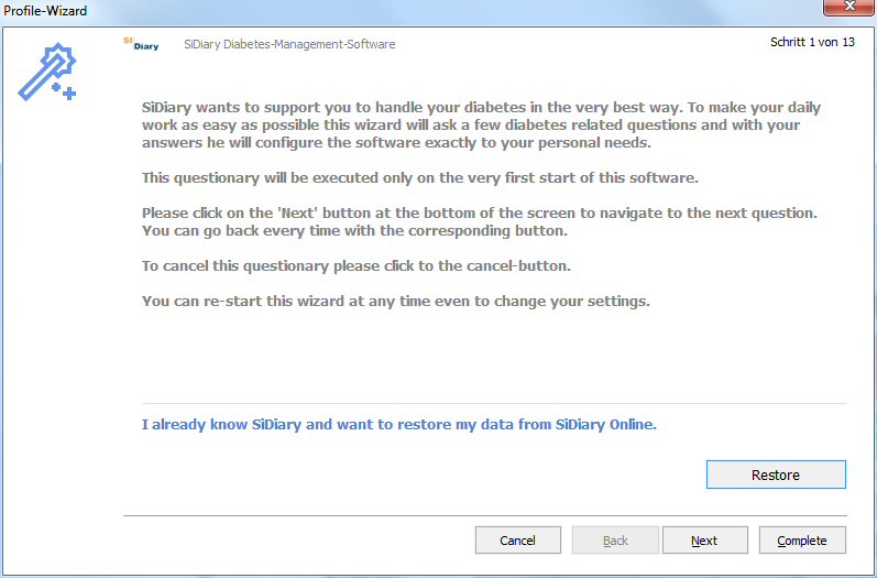 And if you have installed the predefined US version of SiDiary, this package comes with settings for using the US bolus formula and am/pm time format. If you have installed the multi-language package, you will see the language selection screen on the very first start of the software. On this screen, you can also select from the 2 bolus formulas!