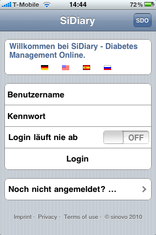SiDiary Online (https://diabetes.sinovo.net) erkennt, wenn Sie mit einem Blackberry-Browser kommen und leitet Sie dann automatisch auf die Adresse https://diabetes.sinovo.net/iwk/ um.