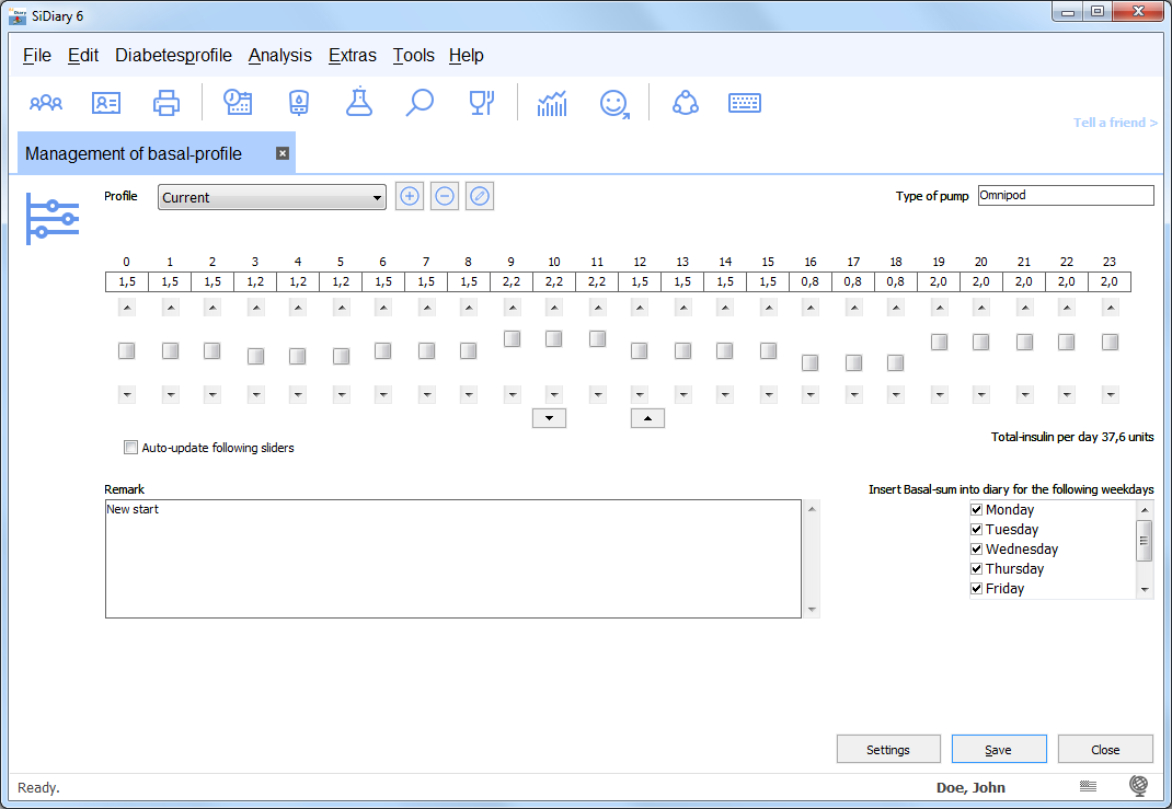 SiDiary can handle an unlimited number of basal profiles. This is interesting for shift workers or people who have different requirements for weekdays and weekend. You can assign your basal profiles to the appropriate weekdays, SiDiary will insert the sum for these days to your daily log automatically as a default value (that can be changed, of course).
