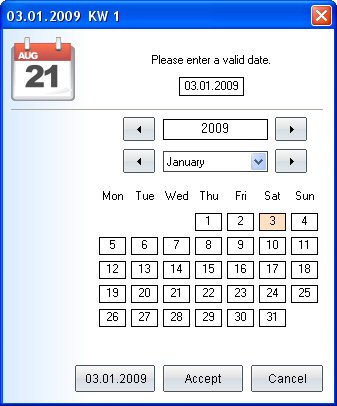 You can enter the date manually or by choosing a displayed date. With the navigation control buttons on the left and right side of year and month you can step a year or a month back and forth. The months are also available in a list box.