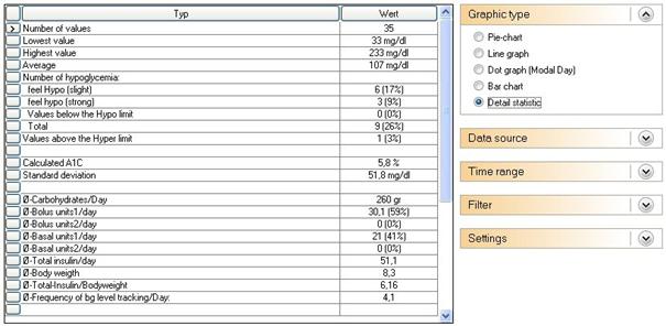 In the detail statistic the selected time range will be analyzed and the found data will be displayed as a text analysis. The interpretation for the example above tells you that 35 measurements have been tracked in this time range. The lowest value was 23 mg/dl. and the highest value was 233 mg/dl. The average value (sum-up of all single measurements and divided by the number) is 107 mg/dl. Six values were marked with mild hypoglycaemia symptoms (= slight low blood sugar), 3 serious hypoglycaemia symptoms, but none measurements were under the hypoglycaemia limit and were not marked with a hypo sign (= unnoticed hypos. If they appear more than a few times you should talk with your diabetes team).