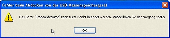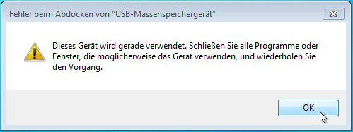 In dem Fall greift noch ein Programm auf den Stick zu (z.B. der Windows Explorer). Wenn Sie jetzt den Stick einfach abziehen besteht die Gefahr, daß Daten verloren gehen. Es könnte die Dateizuordnungstabelle (FAT = File Allocation Table) beschädigt werden und dann weiß Windows nicht mehr, in welchem Speichersegment sich eine bestimmte Datei befindet und kann die nicht mehr anzeigen.