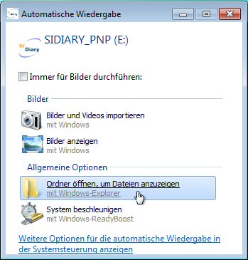 Bei Windows 7 ist der Autostart für ausführbare Dateien nicht mehr verfügbar. Sie bekommen also nach dem Einstecken des Sticks dieses Fenster zu sehen: