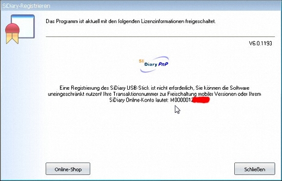 Anders als bei der Version 5 ist hier auch eine Transaktionsnummer enthalten, mit der Sie SiDiary auch auf dem PC und mobilen Geräten (Pocket PC, Windows Smartphone und Java-Handy) installieren und in vollem Umfang nutzen können.